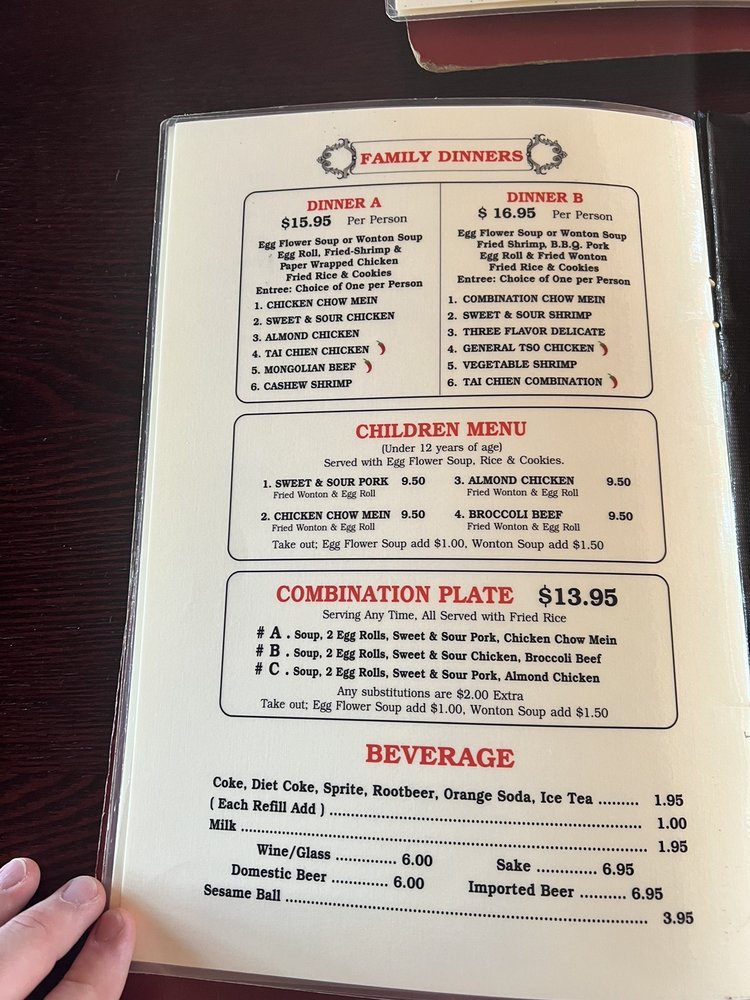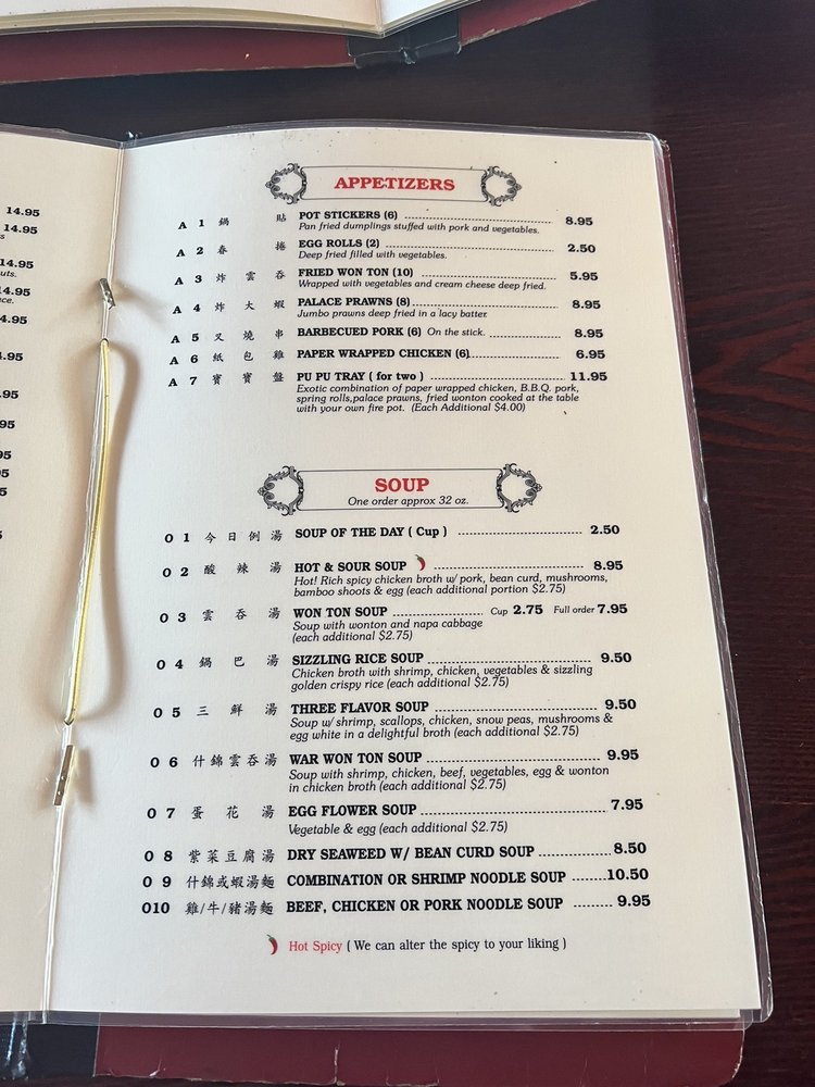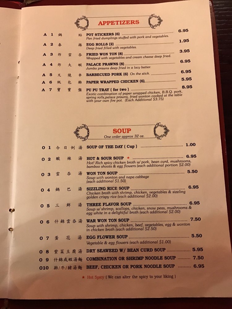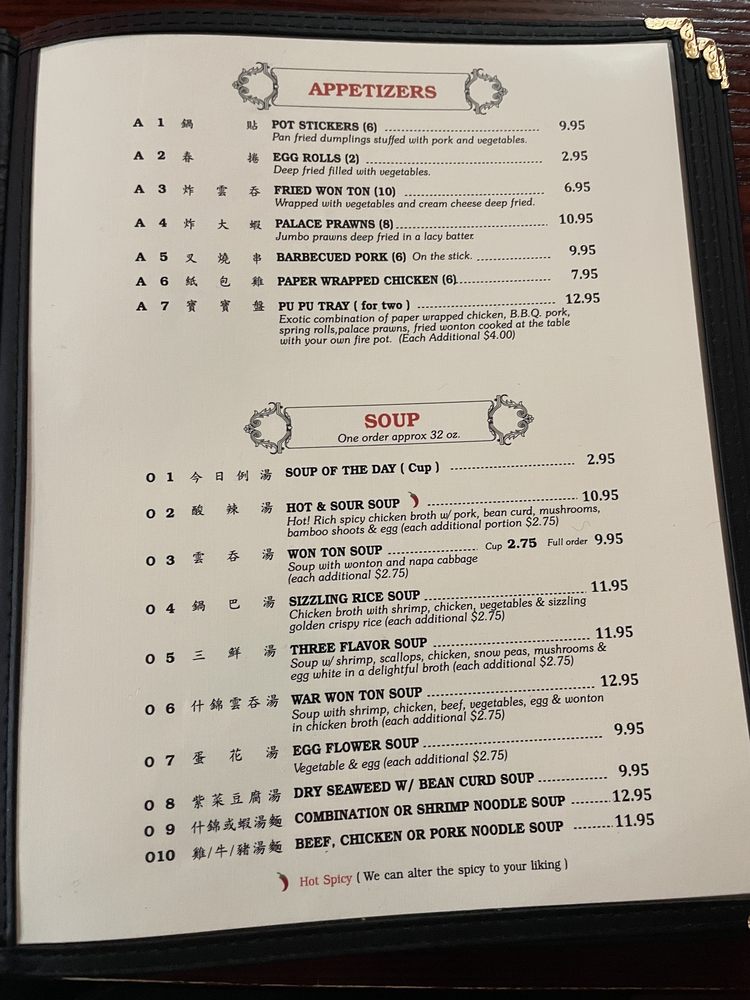 Soup, 2 egg rolls, sweet and sour pork, chicken chow mein.