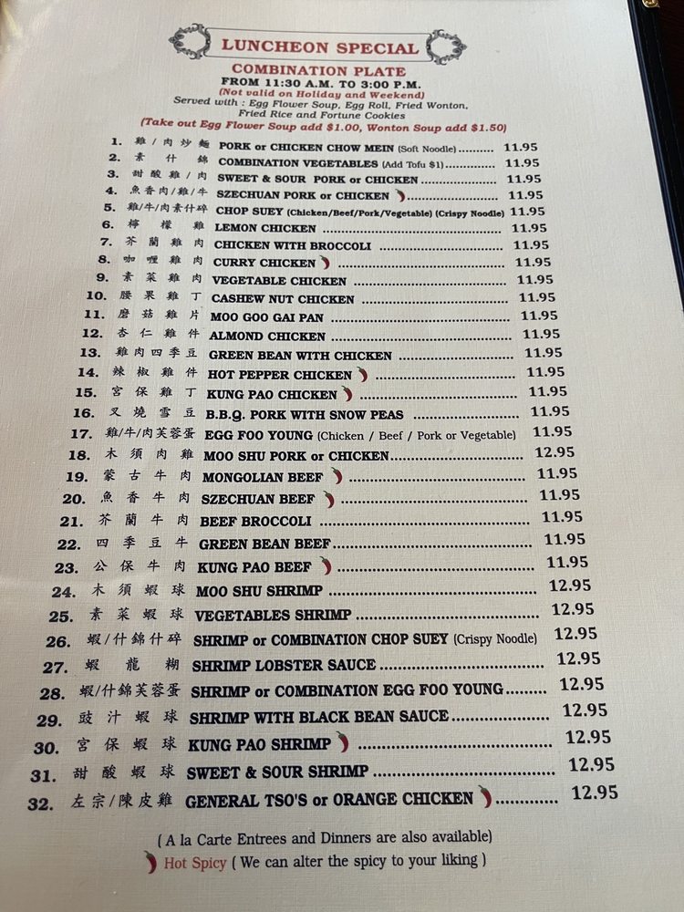 Soup, 2 egg rolls, sweet and sour pork, almond chicken.